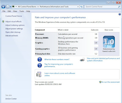 Windows 7 is a performance tools you need to know when you use Windows 7. Why? because the performance tool you can see the grades where performance computer desktop or note book or net book. Performance tools to view your computer you must be in administrator mode if you do not need to enter passwords to see performances of this tools. The following steps are to see your computer's performance tools for those who use Windows 7 as the operating system. My computer is a performance when using low but I think windows 7 performance has improved. Here is a performance tool on my computer so how?